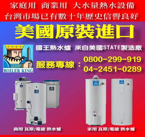 美國原裝進口國王電能/瓦斯熱水爐專業熱水爐設備供應熱水設備美國原裝進口king國王 電能/瓦斯熱水爐0800-299-919 美國原裝進口STATE商業用/家庭用 電能/瓦斯熱水爐.來自美國STATE製造廠.該廠歷史悠久在台灣市場已有數十年歷史.信譽良好.從家庭用商業用大水量熱水設備 規劃 設計 經銷 安裝 維修 服務 365天全年無休 歡迎洽詢 0800-299-919 state water國王熱水器維修 0800-299-919 | |